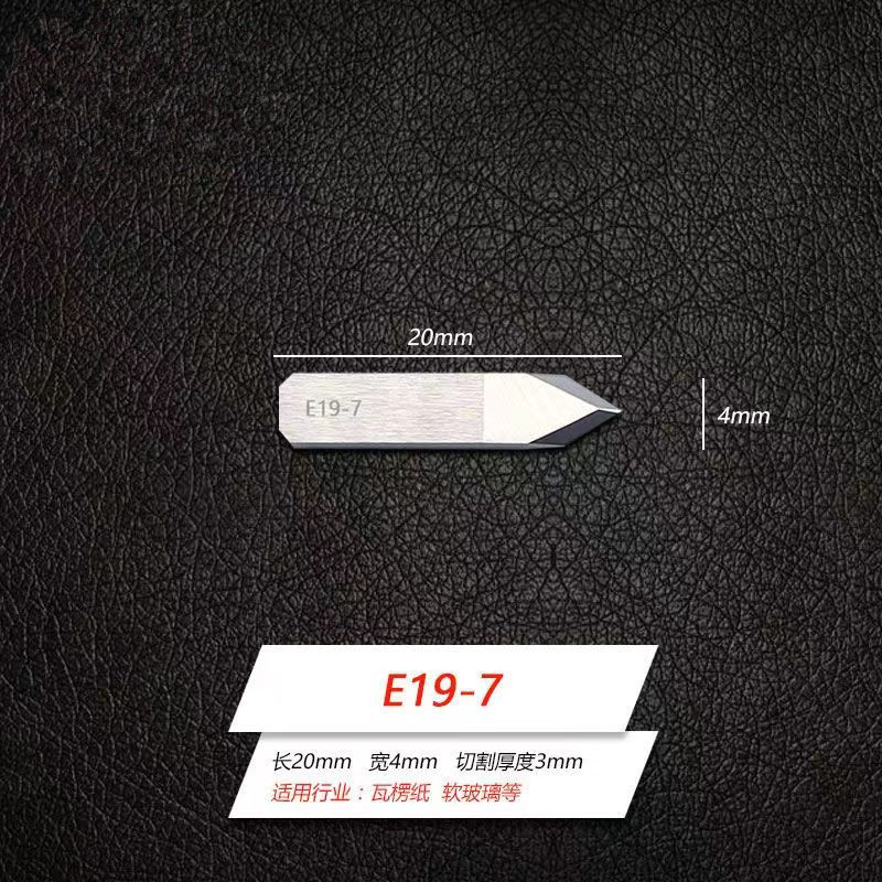 · E19-2: Oscillating blade, tungsten carbide, 19mm height, 4mm width, 15°/80° angle, 0.6mm thickness, up to 12mm cutting depth—used on corrugated cardboard, foam, plastics, vinyl, magnetic foil, and more.