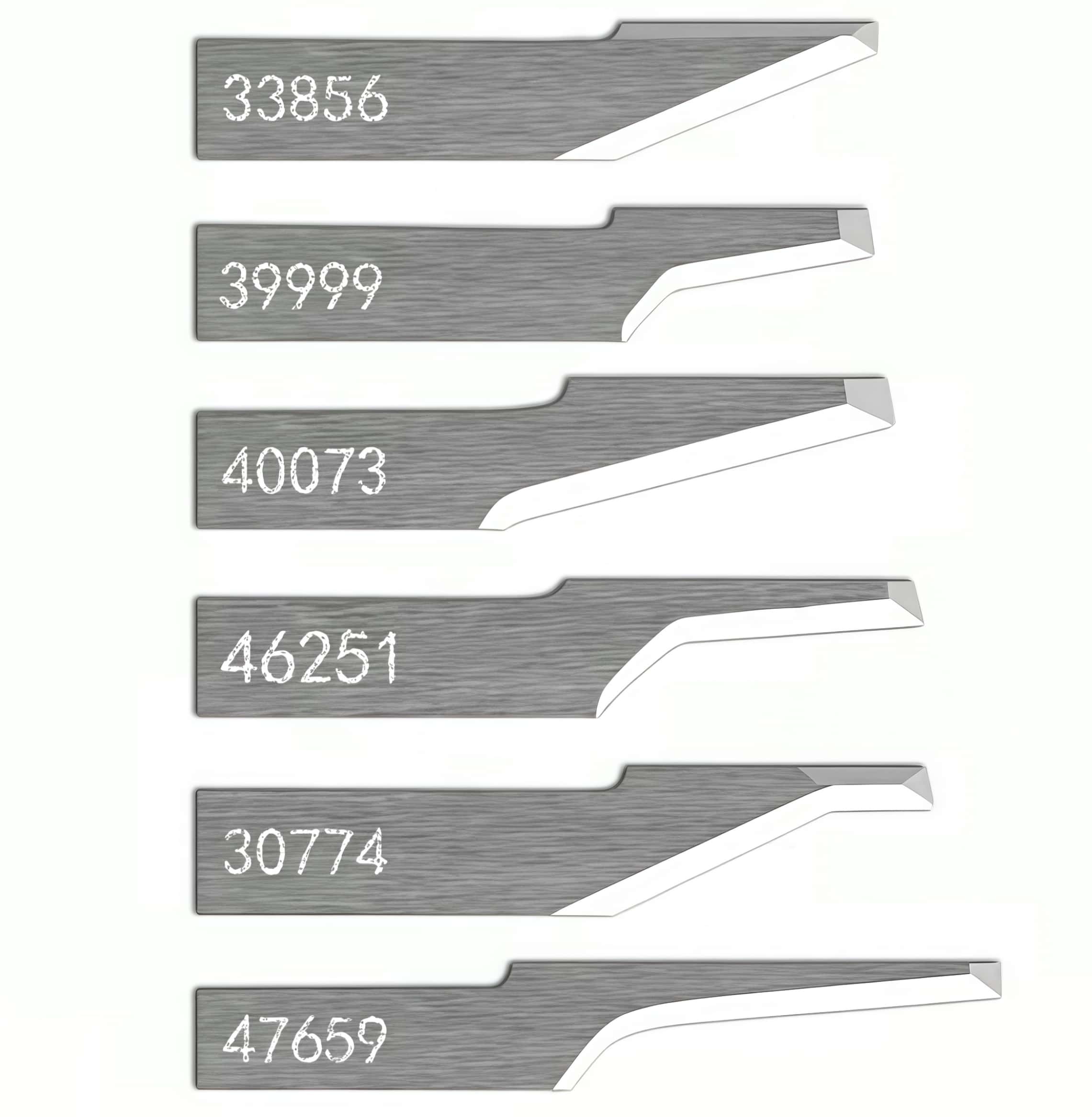 · 39999: 11–15° angle, 0.63 mm thick, preferred for fiberboard, leathers, Texon, 12 mm max cut depth.