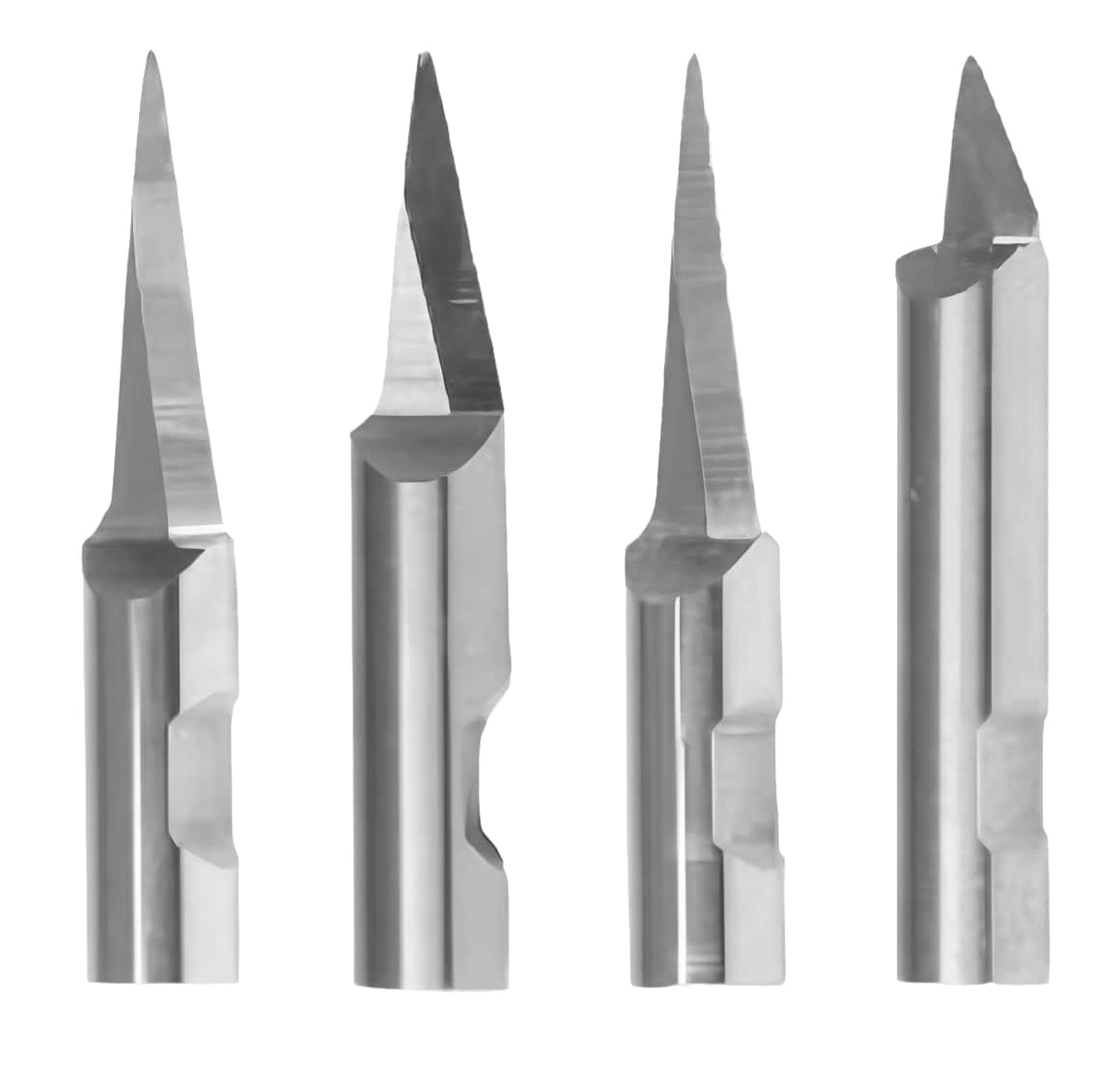 These blades are oscilliating type, solid carbide, and have round shanks designed for use on CNC cutting machines, suitable for various materials depending on the blade tip shape (flat for fibrous materials, round for harder materials like rubber and cardboard