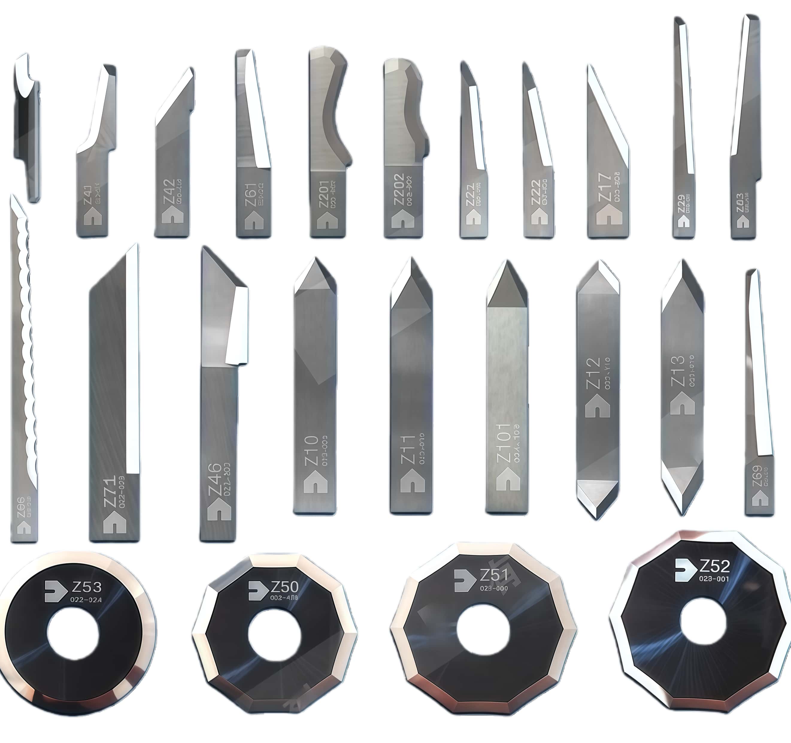 - Zund Z12 blade: A double-edged drag blade made of tungsten carbide, with a 50° flat shank. Suitable for cutting canvas, cardboard, foil, shoe materials, gasketing materials, hard foam, hard plastics, magnetic foil, paper, plastic, polycarbonate, polyester fabric, PVC, self-adhesive foil, shoe soles, and tarpaulin.