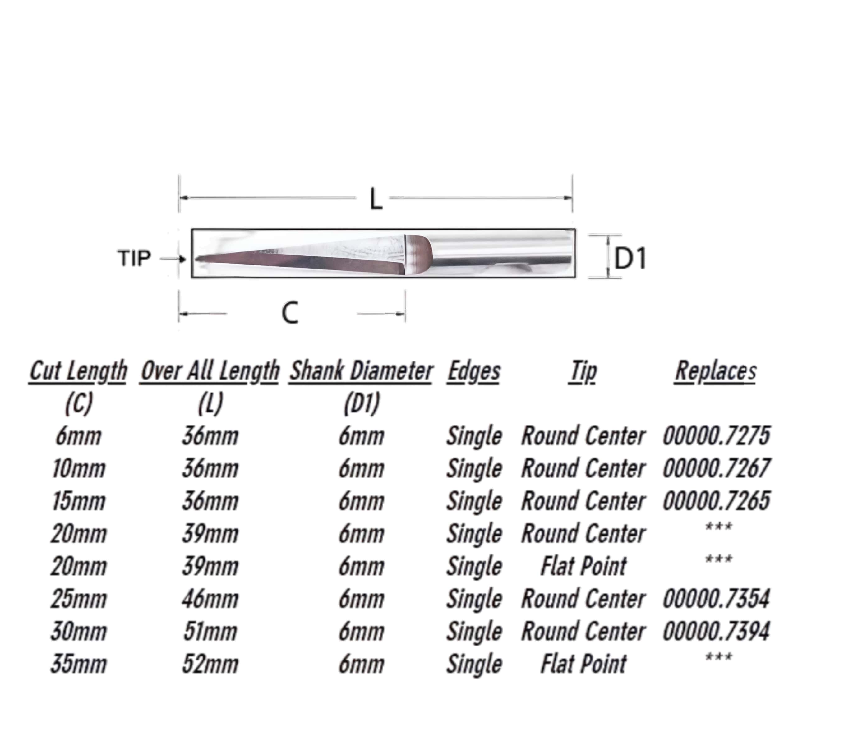 | Part Number | Cutting Depth | Shank / Mount | Notes / Applications |